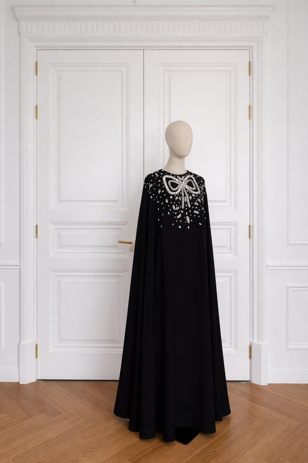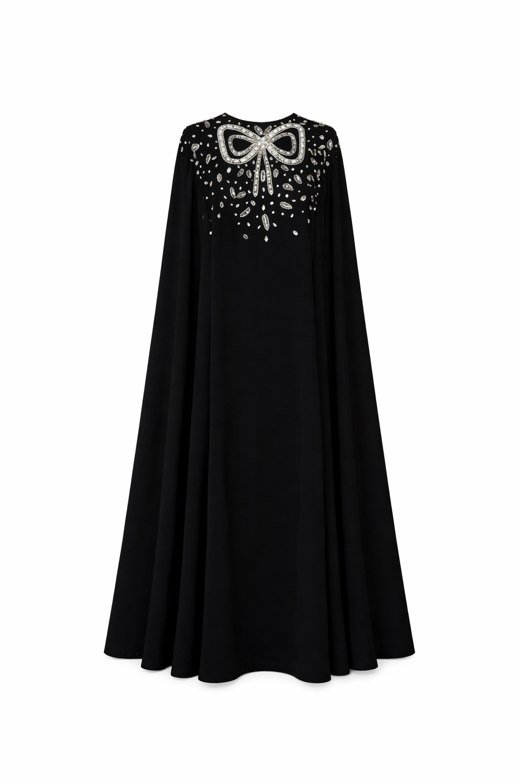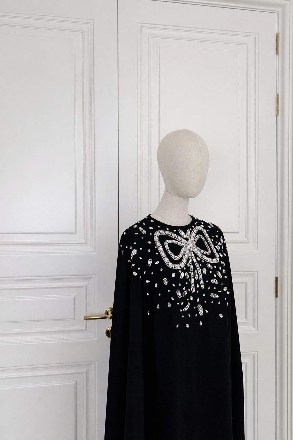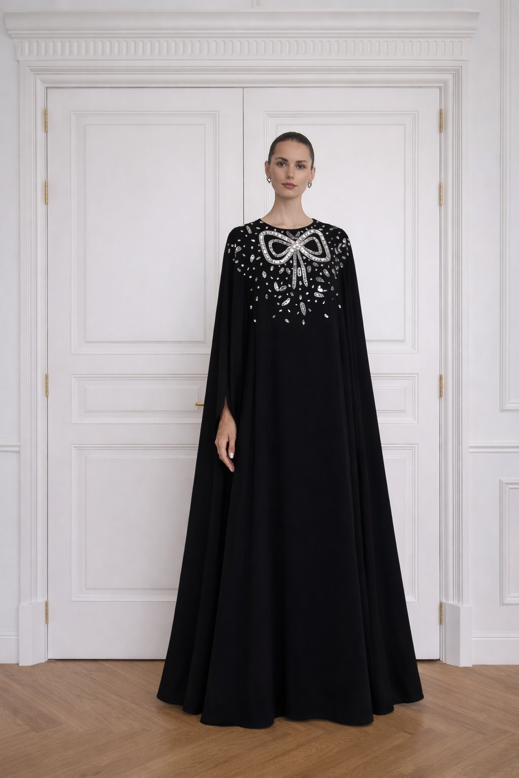 Göğüs kısmındaki ışıltılı taş işlemeleri ve zarif fiyonk detayıyla dikkat çeken bu siyah kaftan elbise, klasik şıklığın en etkileyici halini sunar. Dökümlü kesimiyle asil ve güçlü bir duruş sağlar. Gece davetleri için göz alıcı bir parça.