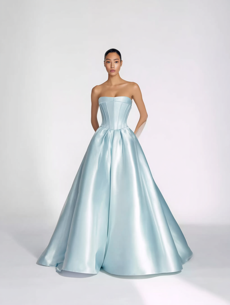 Korse formundaki üst yapısı ve saten dokulu kabarık eteğiyle zarif ve güçlü bir siluet sunar. Zamansız tasarımıyla nişan, davet ve özel geceler için göz alıcı bir seçim.