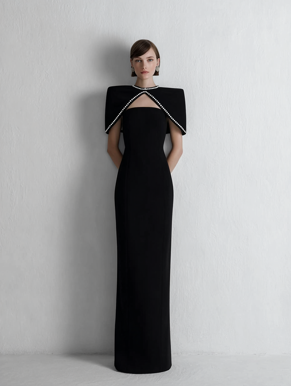 Heykelsi pelerin formu ve inci detaylı yaka kesimiyle güçlü bir siluet sunar. Minimal tasarımı sayesinde sofistike ve çarpıcı bir duruş yaratır. Özel gecelerde modern bir imza niteliğindedir.