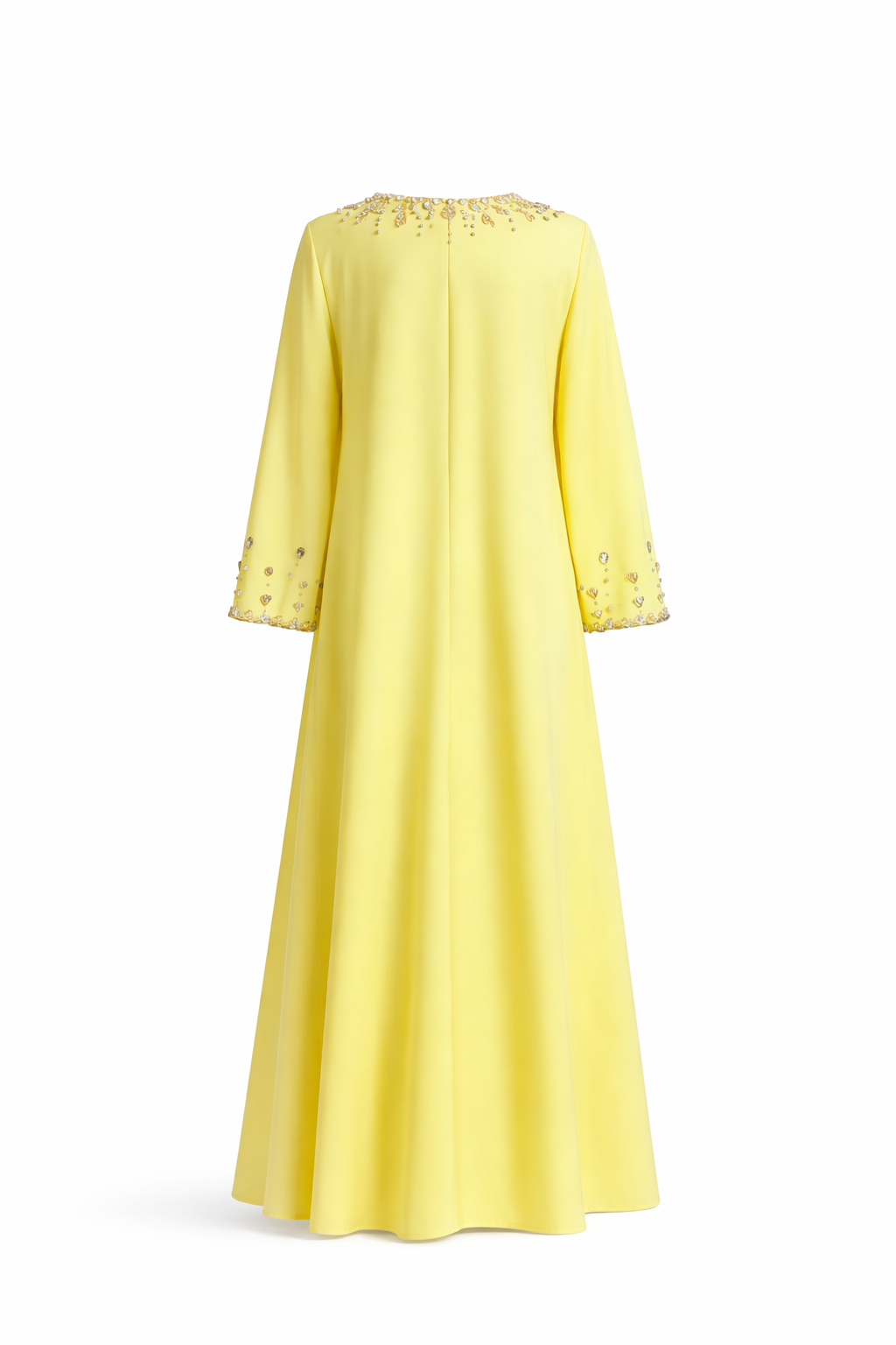 Yaka ve kol uçlarındaki el işçiliği taş detaylarıyla öne çıkan bu uzun elbise, akıcı ve hafif dokulu kumaşıyla zarif bir siluet sunar. İçten astarlı yapısı sayesinde konforlu bir kullanım sağlar.