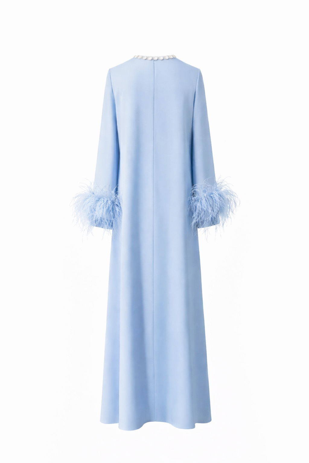 Akışkan krep kumaştan tasarlanan bu uzun elbise, sade silueti ve zarif detaylarıyla modern bir şıklık sunar. Bisiklet yaka formu, el işçiliği taş aplikeler ve kol uçlarındaki tüy detayları tasarıma sofistike bir hareket katar. Rahat kesimi sayesinde hem konforlu hem de zarif bir duruş sağlar.Astalıdır.