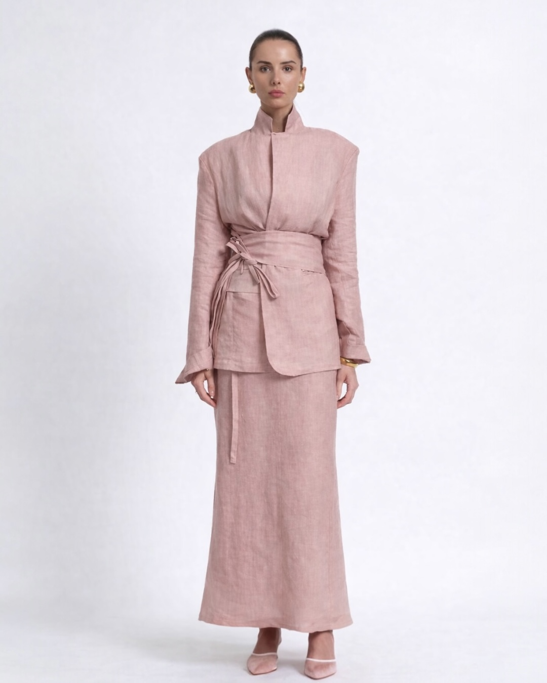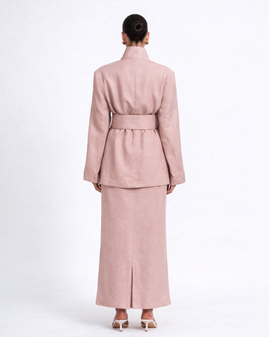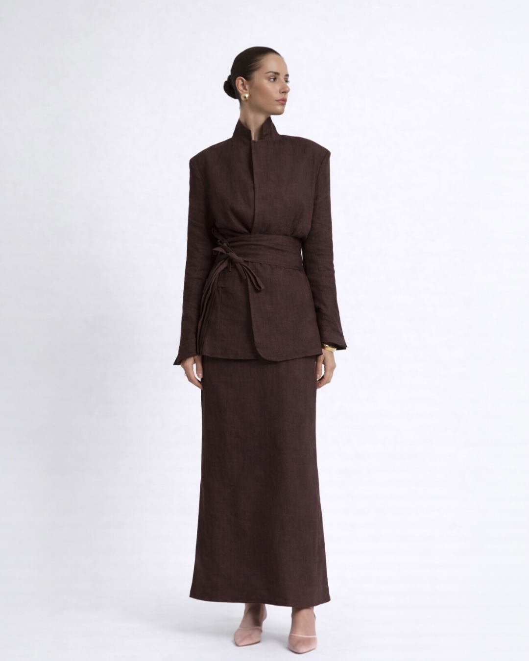 Ürünümüz ön sipariştir. Tunus’ta üretilmektedir. Takım astarsız yazlık üründür. Keten kumaş kullanılmıştır. Ceket vatkalı oversize kesim. Boy 70 cm. Etek boy 95 cmdir. Rahat kalıptır.
