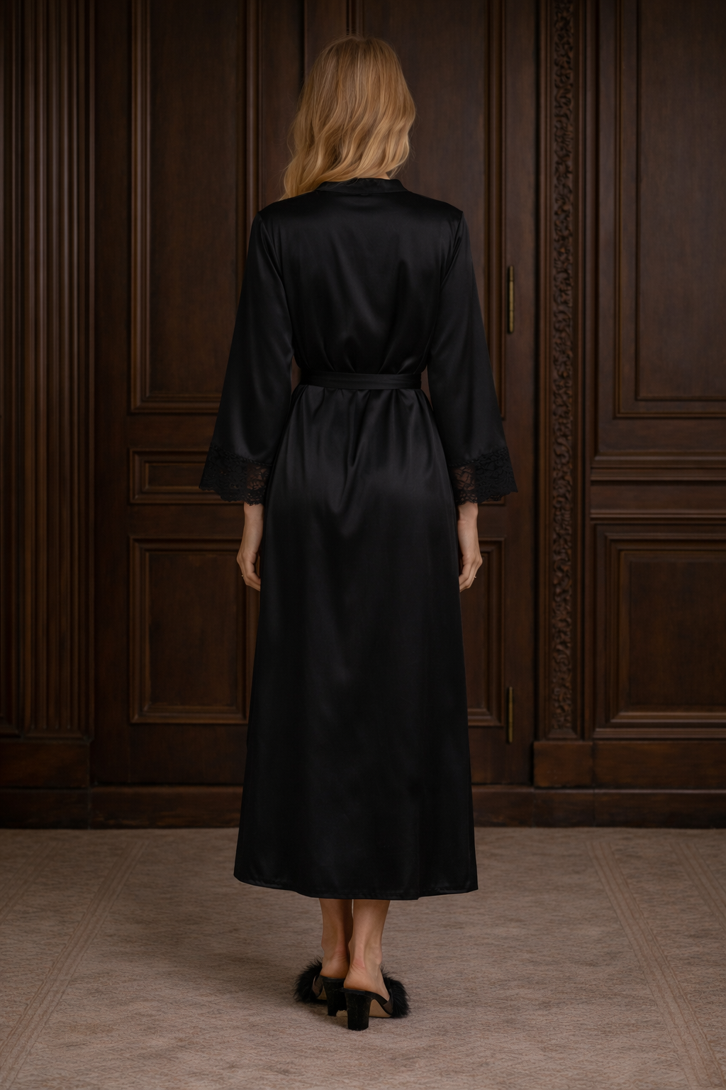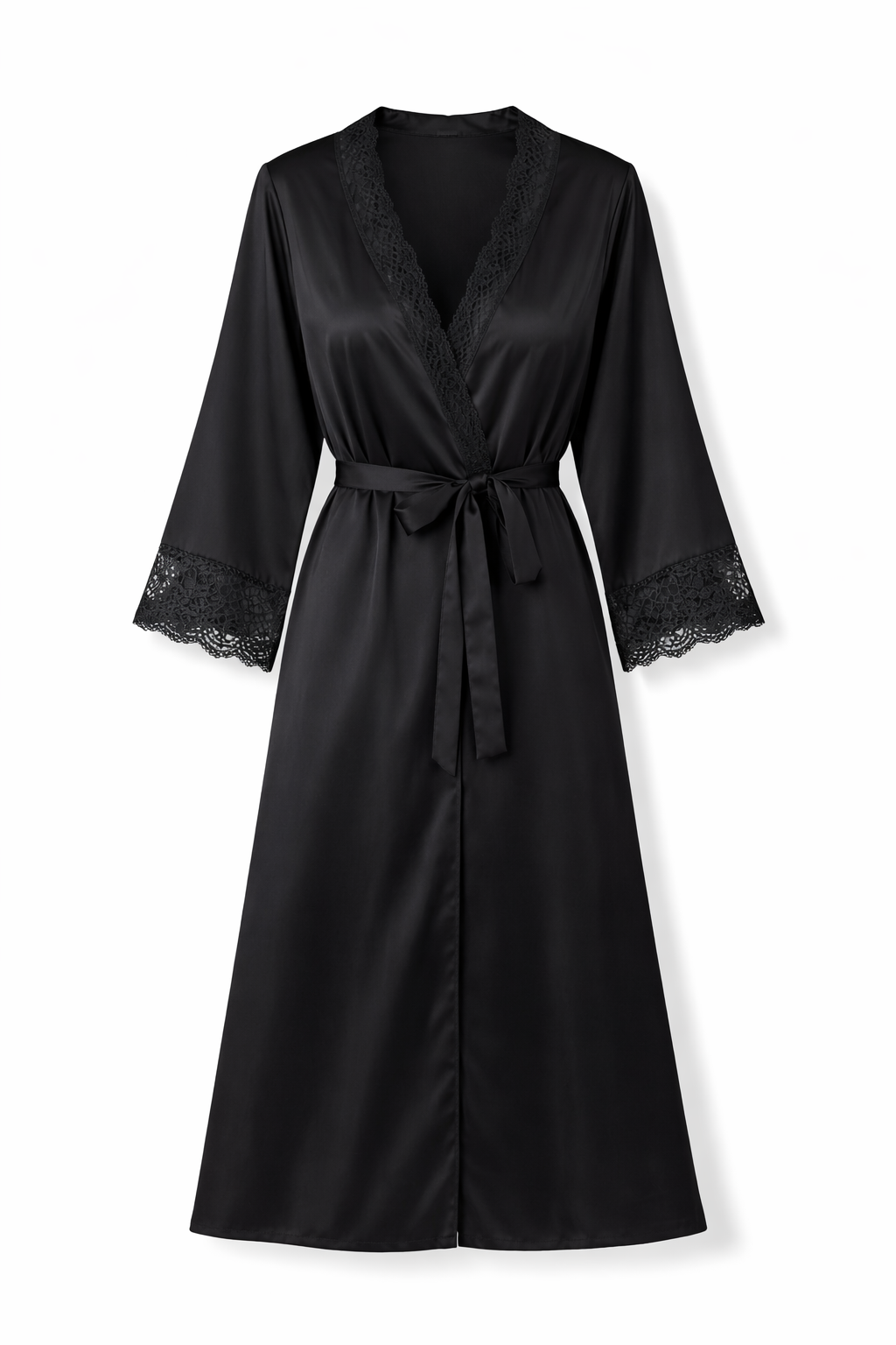This black satin robe features a silky texture accented with delicate lace details. With its fluid silhouette and adjustable waist tie, it offers a timeless and sophisticated look for special moments.