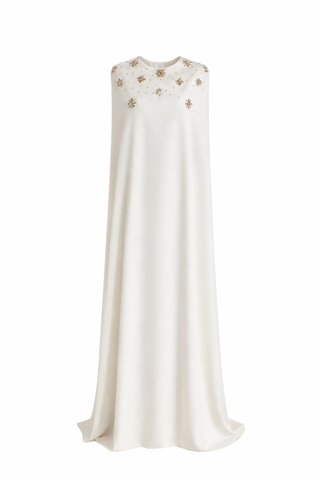 Akıcı pelerin silueti ve yaka çevresindeki zarif taş işlemeleriyle öne çıkan bu uzun elbise, sade ama güçlü bir duruş sunar. Hafif ve dökümlü kumaşı sayesinde hareketle birlikte zarif bir akış sağlar.
